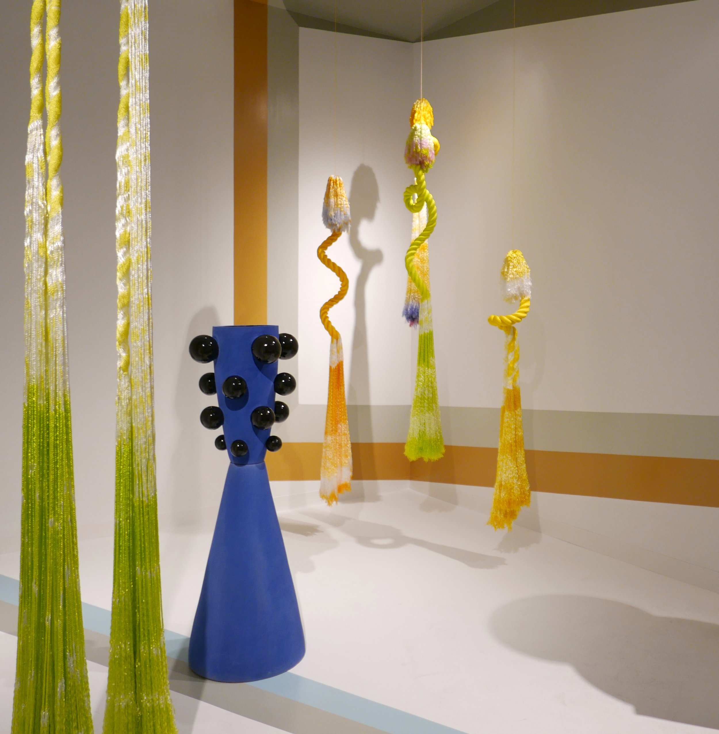 ModernArchitect was commissioned by Norwegian Crafts to design the country’s stand at Design Miami in 2017. Designed specifically to exhibit the works of the textile artist Ellen Grieg and the ceramicist, Elisabeth von Krogh, the installation plays with ambiguous dimensions. Seemingly random stripes on the walls, floor, and ceiling, when viewed from specific positions, coalesce into three-dimensional illusions that “frame” the artworks.
