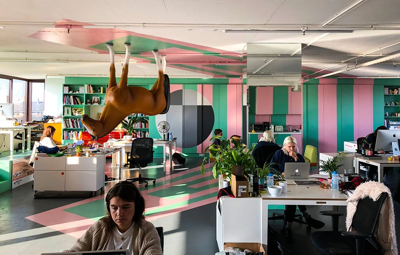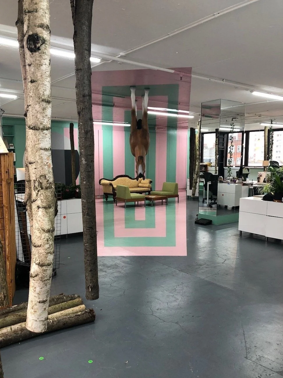 This design for the East London studio of the Dutch communications agency, KesselsKramer continues the agency’s long-standing working relationship with Sean Griffiths who, as a director of FAT, designed their studios in Amsterdam and their previous London outpost in Hoxton. Consultation with the agency’s staff established the desire for a heavily planted, garden-like space with surreal qualities. This is achieved through the creation of a communal/meeting area defined by the illusionistic application of a painted motif on the floor, walls and ceiling, which makes furniture and object placed upon it appear to float. The studio is informally divided into workspaces by the careful distribution of birch tree trunks, hung from the ceiling which contribute to the desired effect of a surreal garden.